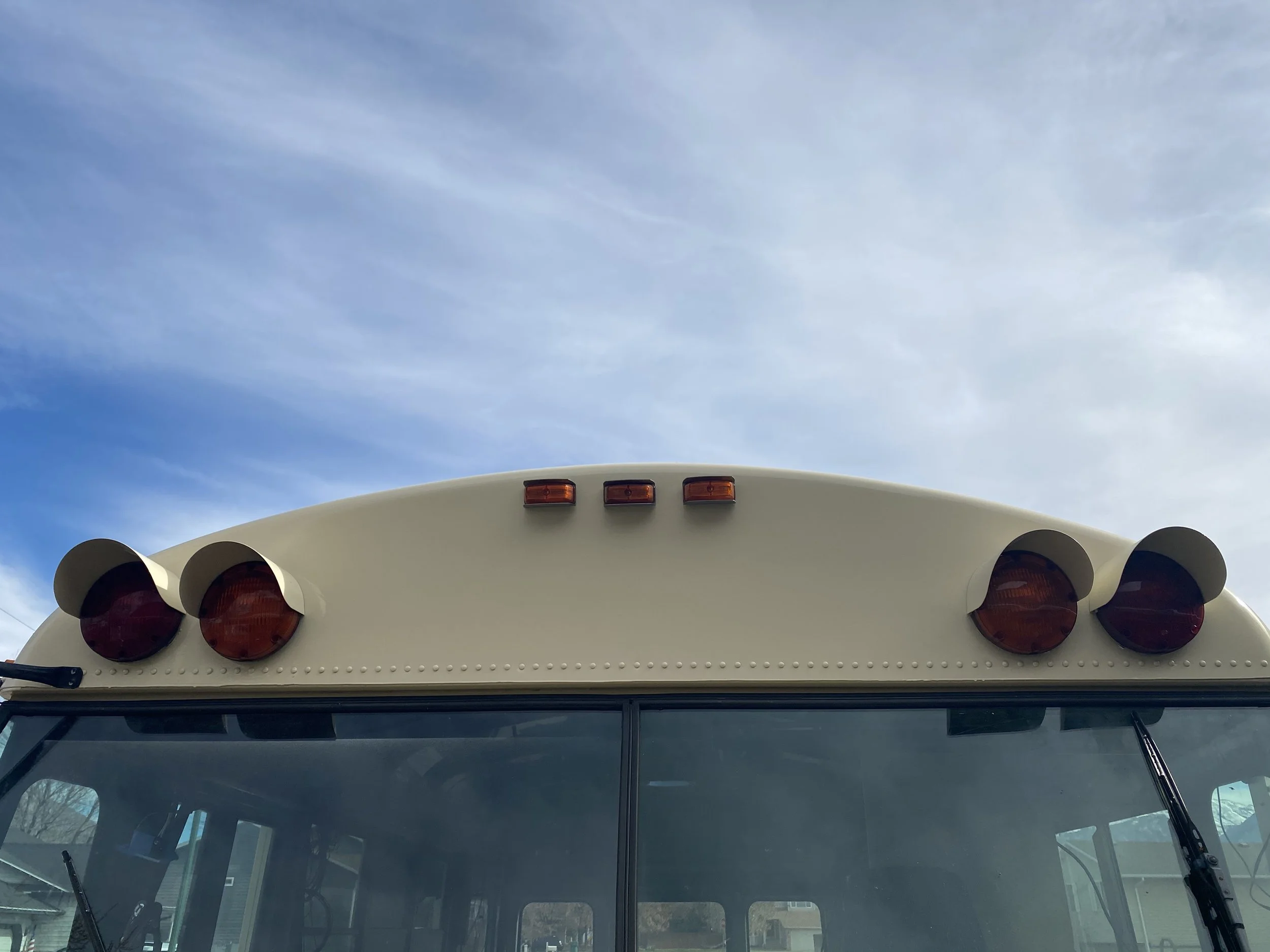We added an external storage compartment for propane tanks, hot water heater, and diesel heater. It was salvaged off another school bus and is currently still yellow. I want to paint it with the same cream-colored Rustoleum as the rest of the bus before it sells.